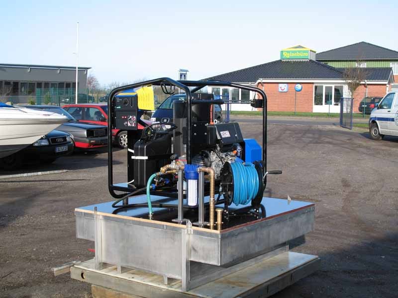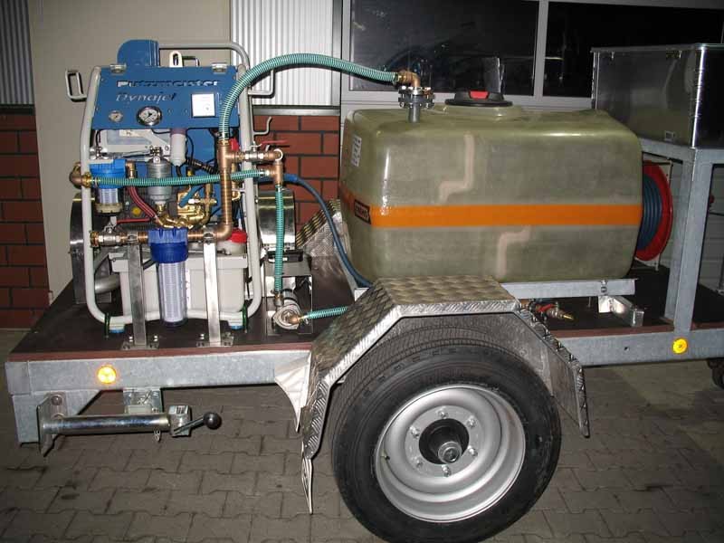 Als Kompakteinheit zum direkten Aufbau auf einen Pick Up. Der Tank wurde als Schwerpunkt nach unten verlagert und der Geometrie der Ladefläche angepasst. Rechts: