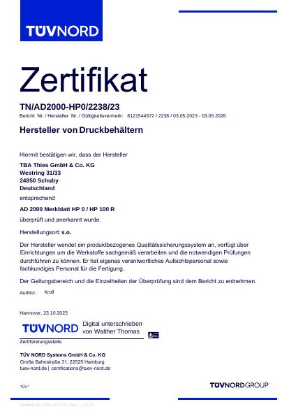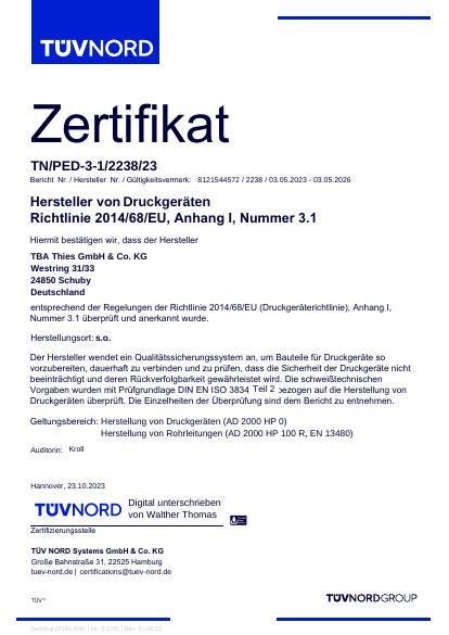 Die richtige Einstufung von Druckgeräten ist Grundlage der Auslegung. TBA Thies GmbH hat umfangreiche Erfahrung im Bau von Druckgeräten aus verschiedensten Werkstoffen. Dadurch sind wir in der Lage, von der Auslegung bis zur Abnahme von Druckbehältern oder Rohrleitungssystemen zu unterstützen.
